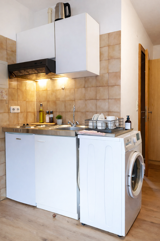 Kochnische mit E-Herd und Grundausstattung zum Kochen (Töpfe, Pfannen, Besteck & Geschirr, Wasserkocher, Salz, Pfeffer, Öl, Tee)